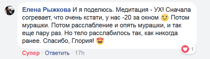 Глория, спасибо, что проводили меня к моей душе, помогли пообщаться с ней и успокоить. Ваша медитация многое изменила во мне. Это удивительно, как несколько минут могут сделать в твоей жизни.